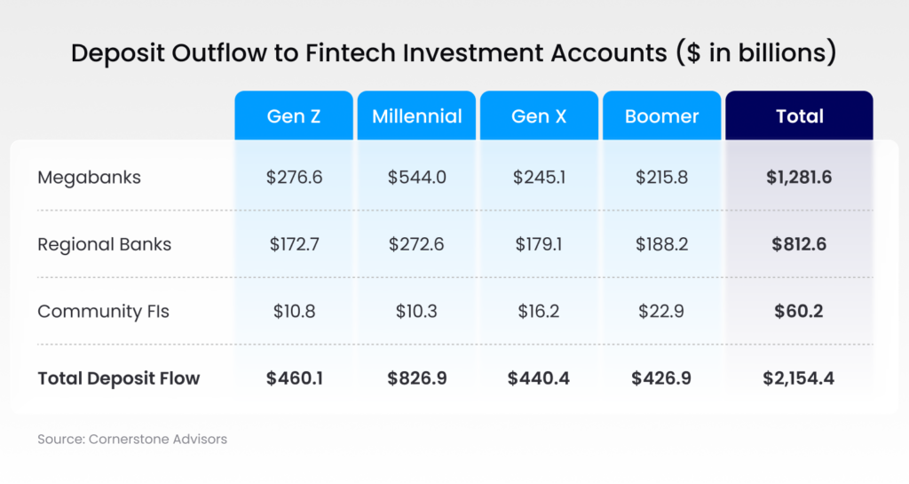 A Cornerstone Advisors report shows that over $3 trillion has shifted from traditional institutions to fintech platforms, including: