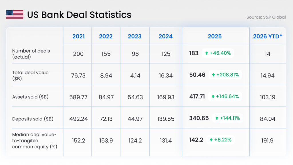 As we noted in the Executive Summary, U.S. bank M&A activity is picking up momentum. With 125 deals totaling $16.34 billion, a number that increased in 2025 to over $50.46 billion.
